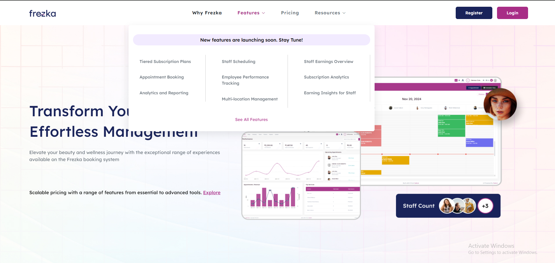 Frezka SaaS brilla por su conjunto de características diseñadas específicamente para el sector de la belleza. La programación de citas basada en la nube es una de las más destacadas, permitiendo reservas en línea 24/7 con confirmaciones instantáneas. Los clientes pueden seleccionar fechas, franjas horarias y expertos preferidos, mientras que el sistema evita superposiciones automáticamente.